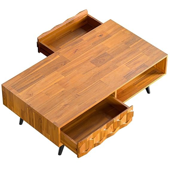 Modern style coffee table known for its combination of solid wood craftsmanship, distinct aesthetic features, and functional storage